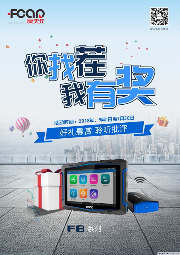 3、活动参与流程介绍: 符合找茬活动资格的用户于活动时间内通过本活动指定参与路径(致电我司客户服务中心400755007服务时间:1)周一至周五8:30-12:00,13:00-17:30)参加对F8系列乘用车诊断仪的找茬报错。